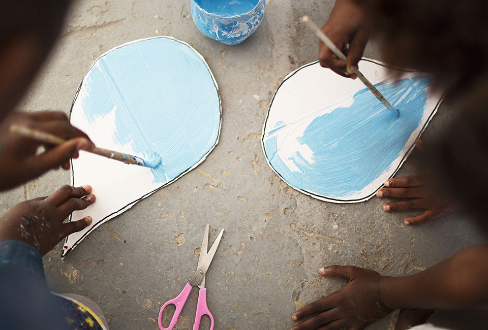 Sometimes it only takes a little bit of time, affection and imagination to become a WELTENMACHER. Together with ARTHELPS, 14 children spent ten days drawing their hopes and dreams in rainbow colours, capturing their thoughts on pieces of cardboards and projecting their desires onto canvases.