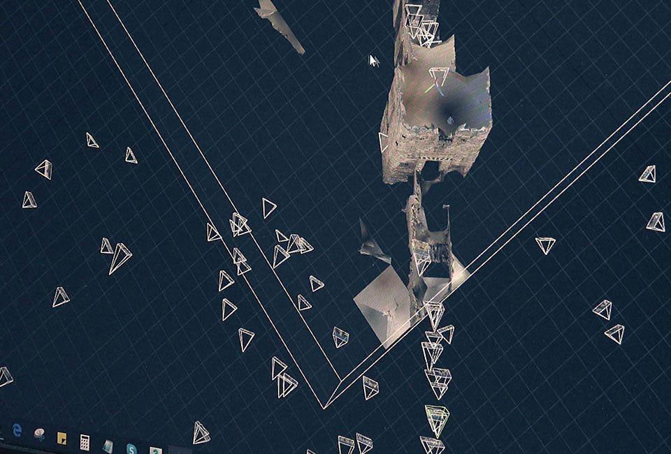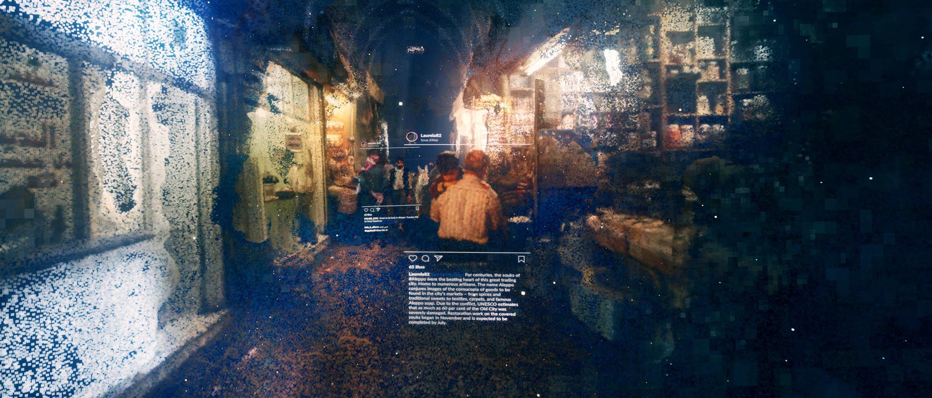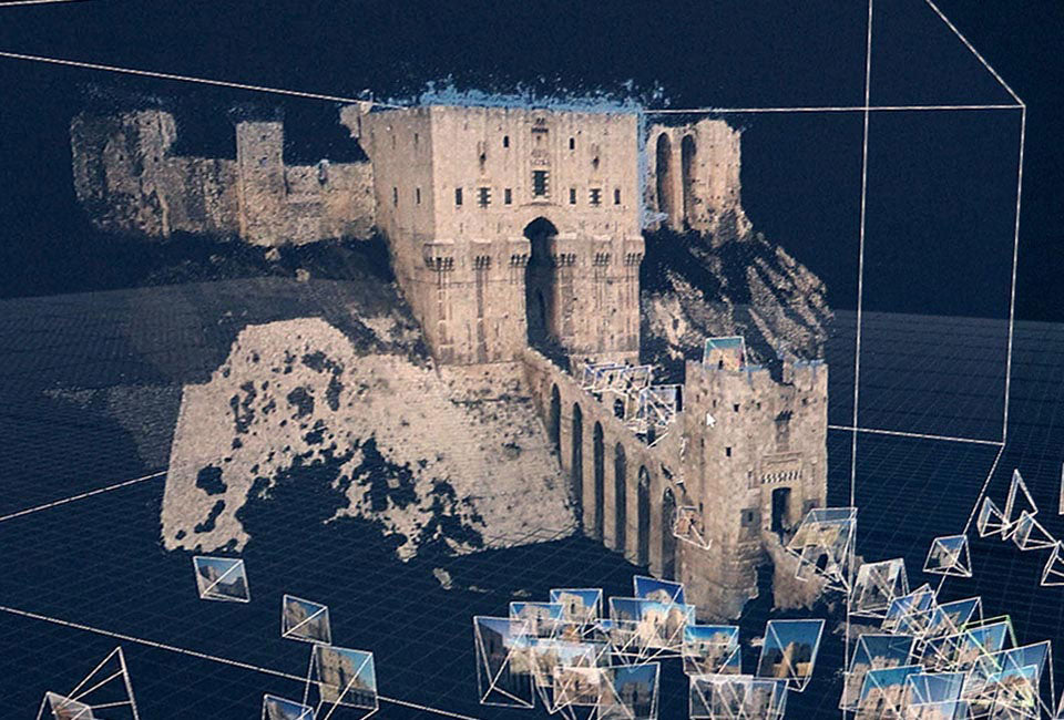 Pre-war posts of three historical Aleppo sites were crowdsourced via geotags in multiple languages, then resorted via deep learning and processed as a dataset for photogrammetry. In a collaboration with Exozet, the two-dimensional dataset was then transformed into immersive 3D environments.