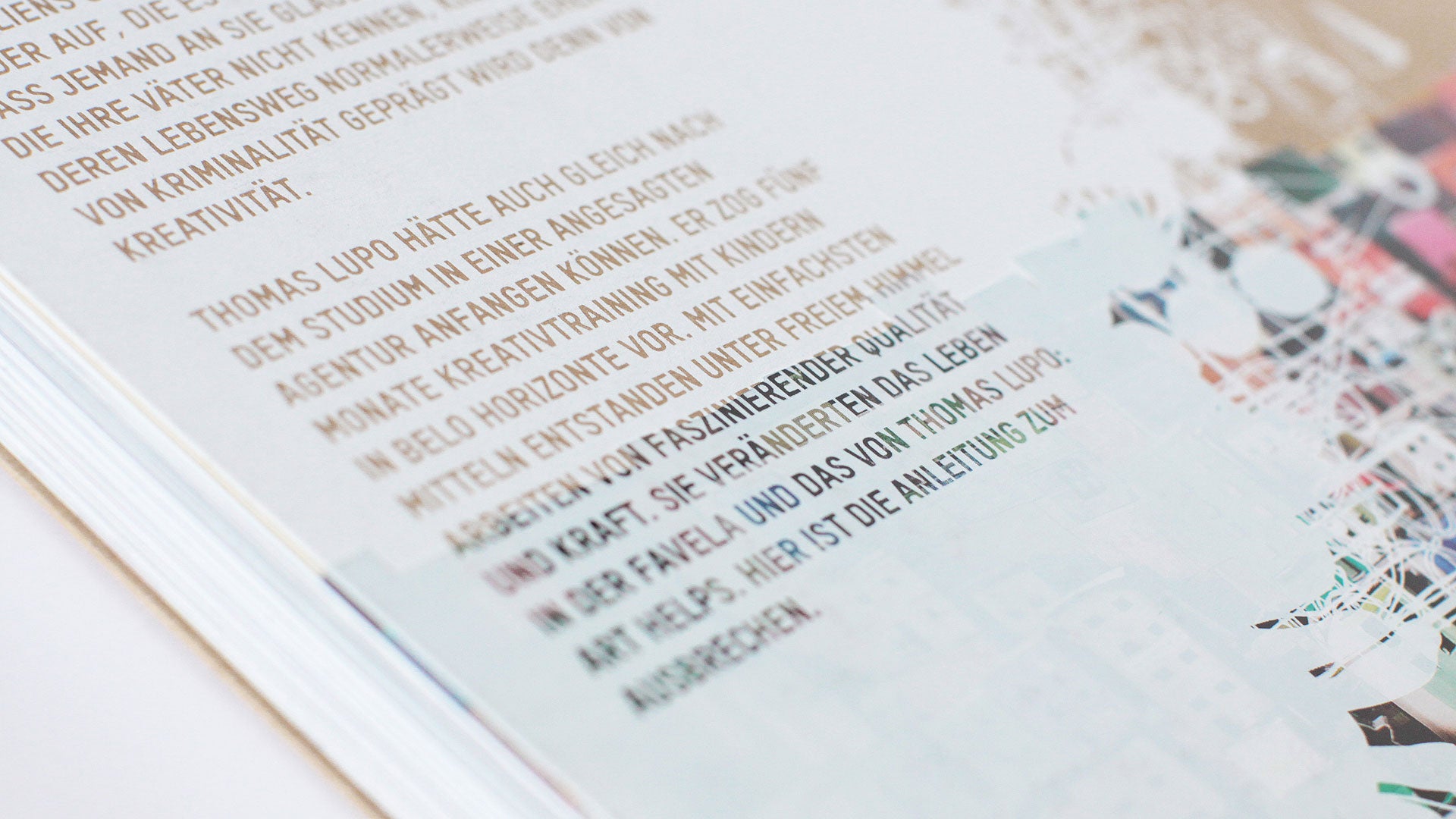Das Buch ANLEITUNG ZUM AUSBRECHEN ist eine Dokumentation dieses Schaffens. Einfühlsam und doch kraftvoll gestaltet, gibt es tiefe Einblicke in die Lebens- und Gefühlswelt der jungen Brasilianer. Das Werk hat einige Designpreise gewonnen und ist im renommierten Designverlag HERMANN SCHMIDT MAINZ erschienen.